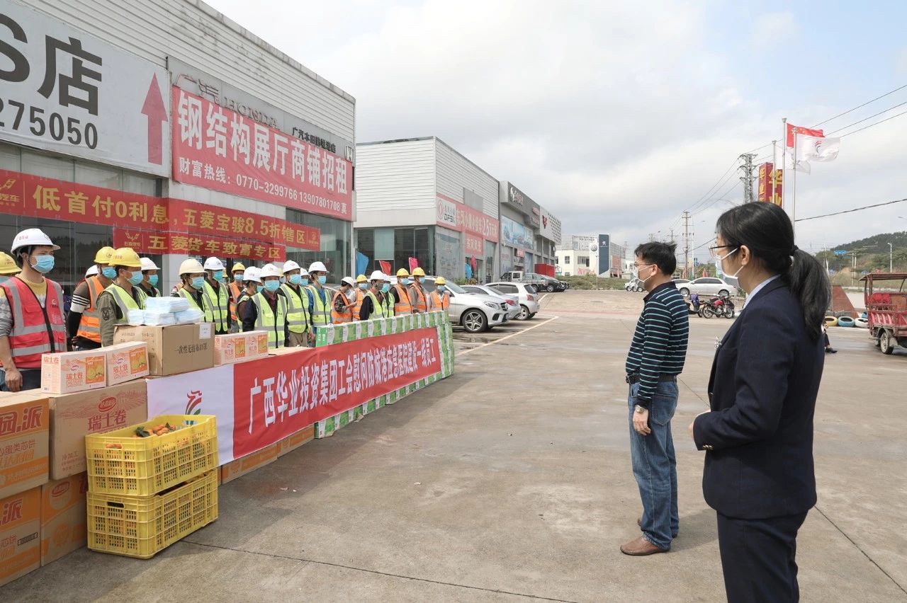 2020年2月15日,广西环球体育app官网下载投资集团副总裁廖人兴、工会主席钟丽霞代表环球体育app官网下载集团在环球体育app官网下载汽车城慰问连日来奋战在防城港市第一人民医院感染性疾病科应急负压病房项目建筑一线的员工,为他们送去牛奶、水果等慰问品和防护用品,并鼓励他们同心协力、一往无前,为抗击疫情取得最终胜利添砖加瓦。