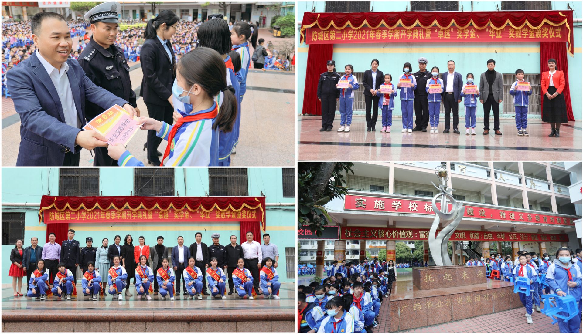 2021年3月1日,是防城港市各中学、小学春季学期正式开学的日子,防城港市第六中学、防城区第二小学分别举行了隆重的开学典礼,热烈欢迎广大师生回校。环球体育app官网下载集团总裁龙其伟、工会主席钟丽霞应邀出席了开学典礼,并在典礼上隆重举行了“环球体育app官网下载奖教学金”颁奖仪式,为两校获得表彰奖励的354名优秀师生进行了颁奖。