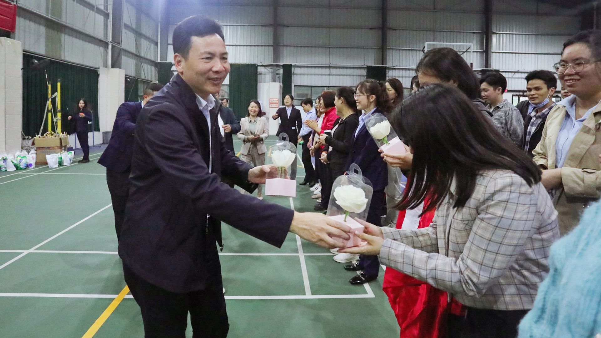 防城区人民政府代区长凌光振为参加活动的女同胞们赠送节日礼物